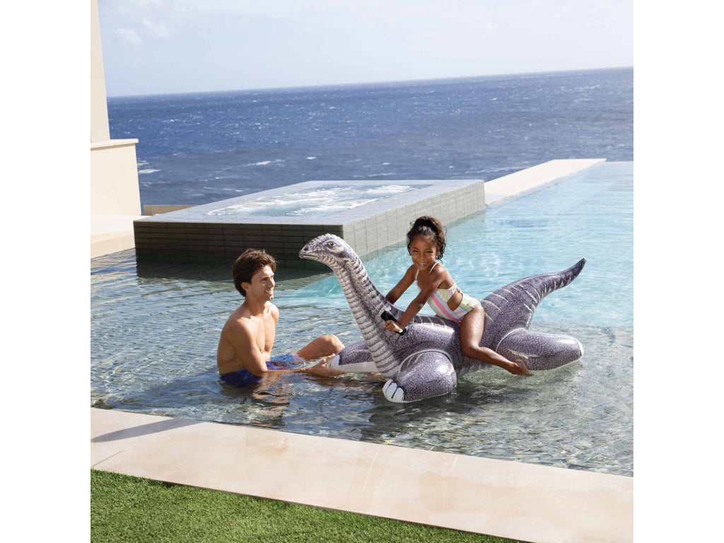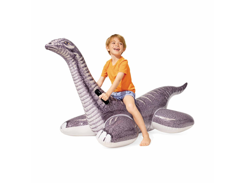 Fai un salto nel passato e galleggia sull'acqua con il Cavalcabile Brontosauro! Prodotto in vinile resistente con tre camere d'aria gonfiabili e dotato di stampa fotorealistica, è perfetto per ore di divertimento al mare e in piscina. Le due maniglie termosaldate permettono di aggrapparsi durante il gioco e di salire e scendere dal gonfiabile in sicurezza. La base è larga, per maggiore stabilità in acqua. Età : 3+ anni. Peso massimo supportato: 40 kg.