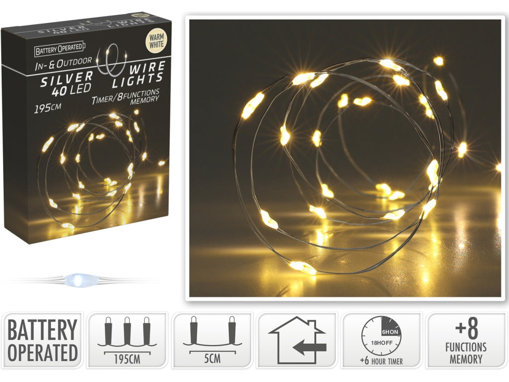 Cavo metallo argento 40 microled bianco caldo, distanza led 5cm, cavo guida 10cm, funzionamento a batteria (3x aa non incluse), con controller gioco luci 8 funzioni e timer per uso interno/esterno, in nuova scatola fotocolor e display con try me