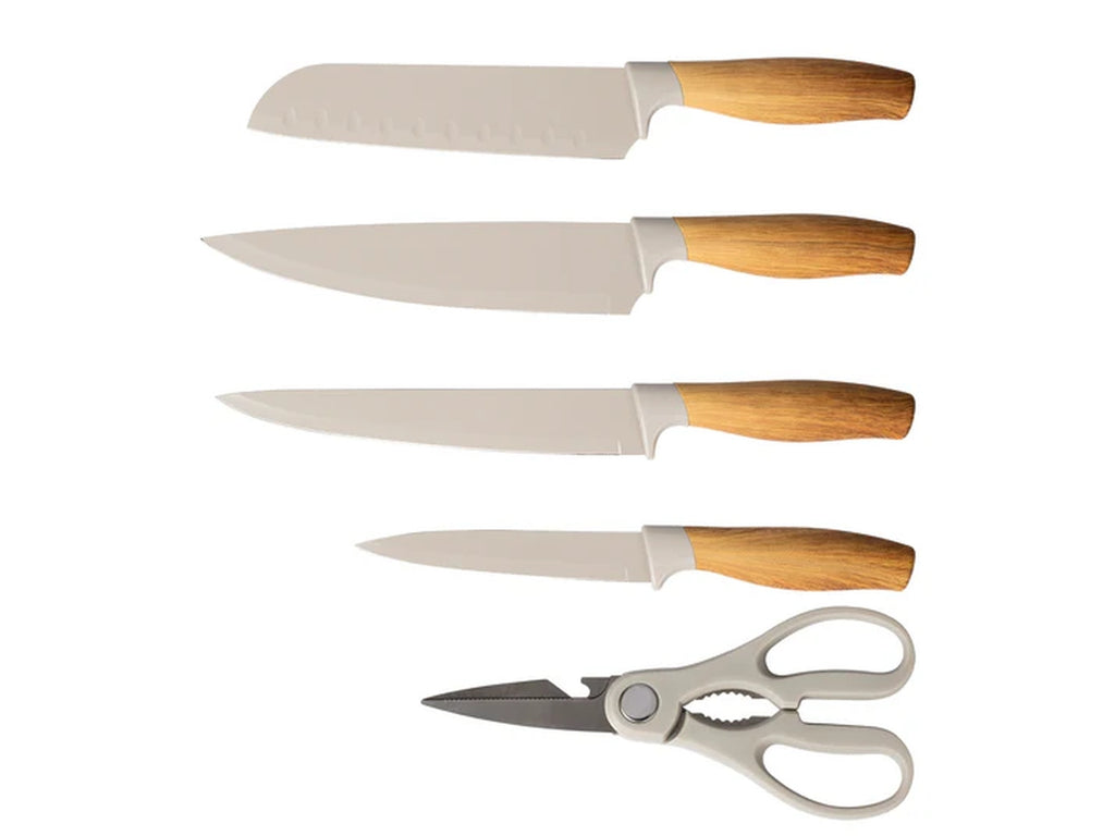 Ceppo coltelli con stand Wood Design 5 pezzi. Eleganza e praticità in cucina! Organizza e tieni in ordine i tuoi coltelli e forbici con il ceppo Wood Design: pratico, sicuro e dal design elegante che si adatta perfettamente a ogni cucina. Le lame in acciaio inox garantiscono precisione e resistenza, mentre il manico effetto legno è ergonomico e antiscivolo per un utilizzo confortevole.