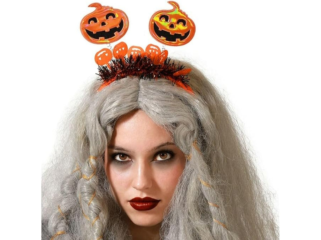 Il cerchietto con zucche è un accessorio divertente e festoso, perfetto per Halloween. Il cerchietto è decorato con due zucche sorridenti arancioni fissate su molle, che si muovono leggermente per creare un effetto simpatico e giocoso. Alla base delle molle, ci sono decorazioni aggiuntive di fili arancioni e neri che donano un ulteriore tocco festivo. Questo cerchietto è ideale per completare costumi o per aggiungere un tocco di spirito di Halloween senza bisogno di un travestimento completo.