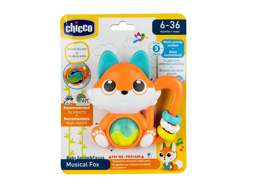 TRILLINO MUSICALE: Sonaglio volpe elettronico con suoni e attività manuali. PALLINA COLORATA: Palla colorata sulla pancia della volpe che ruotando attiva divertenti melodie DENTIZIONE: Orecchie in plastica morbida ideali per la dentizione Sfera sonaglio all'interno della volpe e anelli testurizzati scorrevoli sulla coda di volpe STIMOLAZIONE DELLE CAPACITA' UDITIVE: Le melodie stimolano le capacità uditive e intrattengono i più piccoli con suoni divertenti