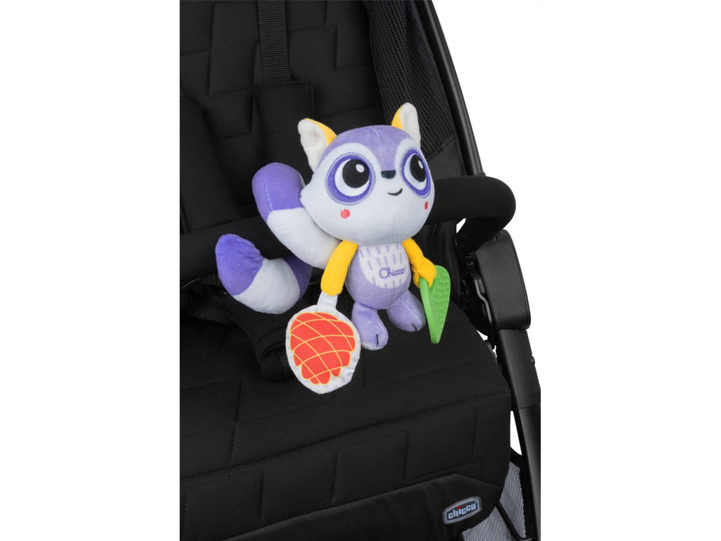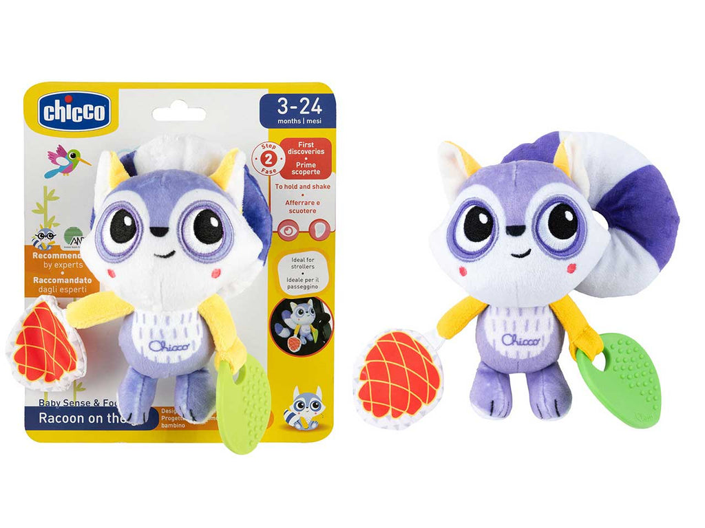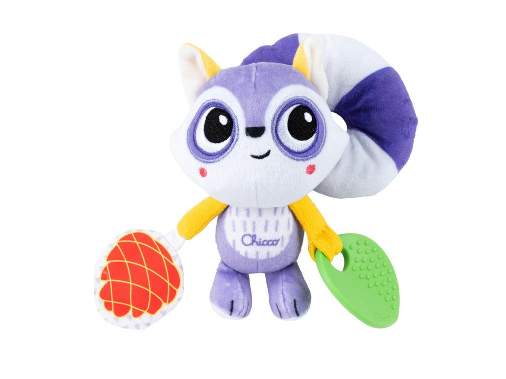 Simpatico sonaglino di procione con una grande coda morbida che permette di attaccarlo in modo semplice al passeggino o al seggiolino auto, per portarlo sempre con te Il Procione tiene in mano un massaggiagengive a forma di foglia, che da sollievo ai bambini durante il periodo della dentizione Il Procione tiene in mano un pendente a forma di pigna con suono increspato