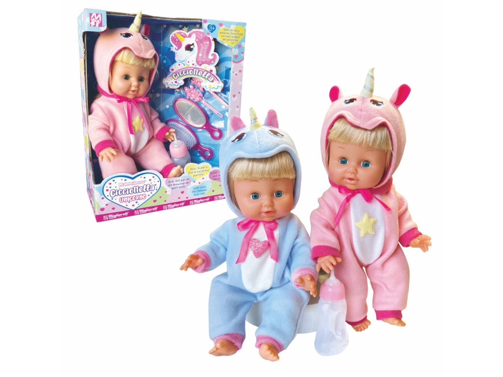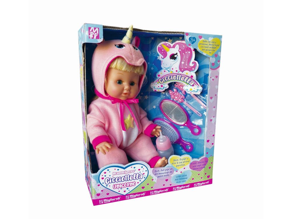 La bambola Cicciotella unicorno beve, fa pipì e dice tante paroline, accompagnata da accessori. Disponibile nei colori rosa e celeste, è realizzata in plastica e tessuto. Consigliata per bambini dai 3 anni in su, appartiene al brand Migliorati. La confezione include una bambola e vari accessori. Il prodotto è certificato CE.