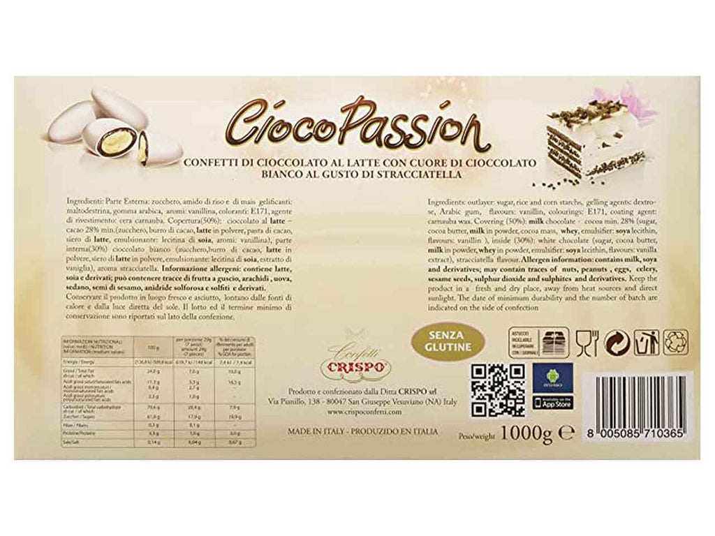 Confetti al cioccolato al latte, con ripieno di crema al gusto di stracciatella. ideali per feste di compleanno, confettata matrimonio, festa di laurea, battesimo. ciocopassion crispo stracciatella. senza glutine