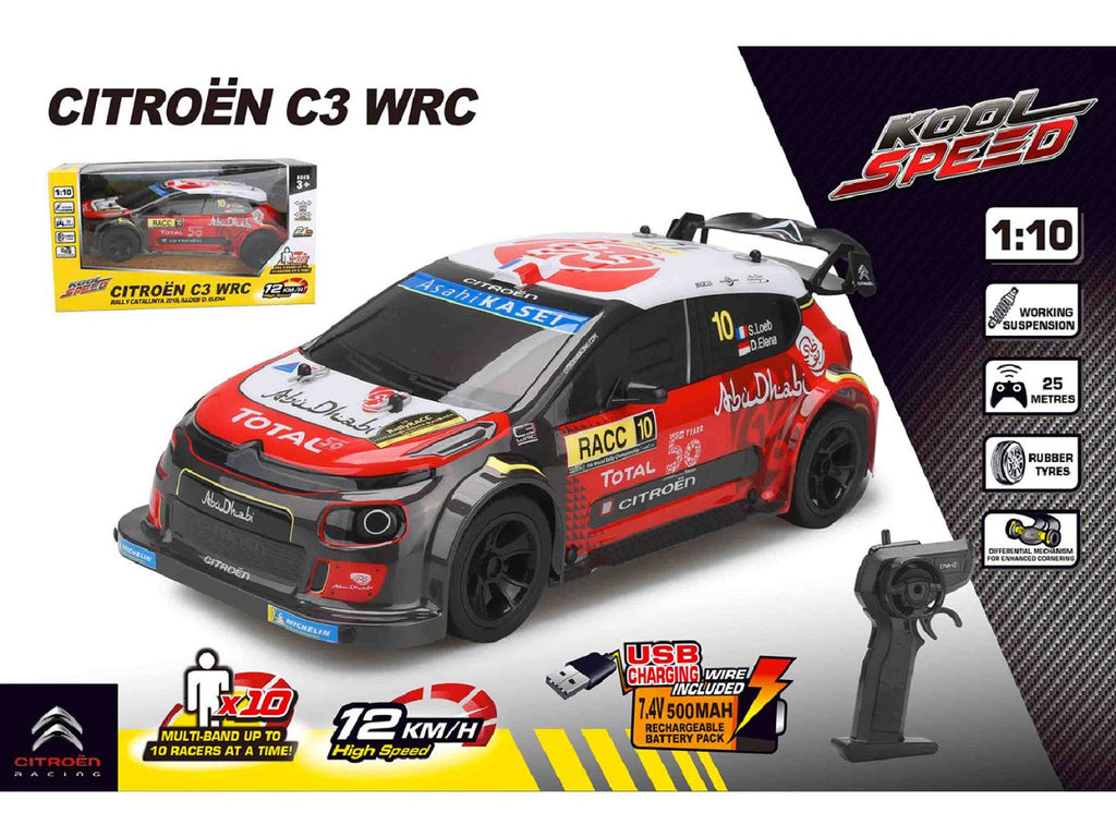 Citroen rally r/c con pack 1:10.riproduzione fedele della macchina citroen c3 wrc in scala 1:10. la macchina telecomandata arriva fino a 12km/h ad una distanza di 25 mt. pacco batterie incluse con caricatore usb.