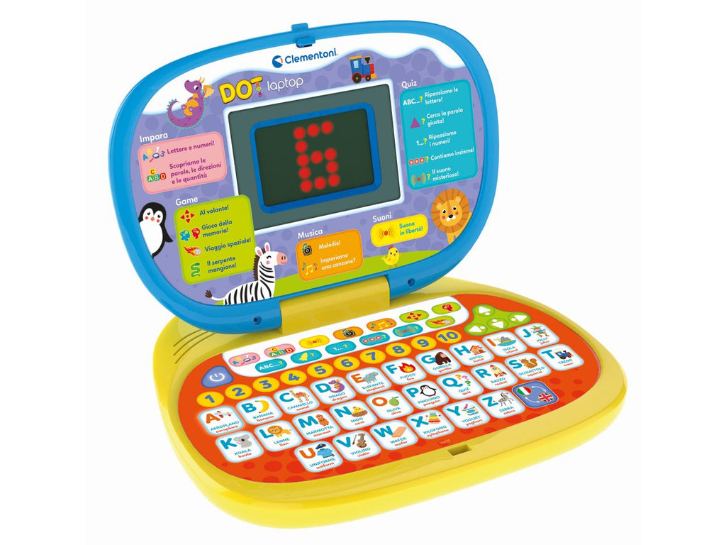 Un laptop interattivo e illustrato per i più piccoli. il bambino scoprirà  l'alfabeto, i suoni delle lettere e si avvicinerà  alla lettura scoprendo lettera per lettera le prime parole. sarà  possibile imparare le melodie più famose, rispondere alle domande e giocare allenando la destrezza e la memoria. 13 attività  di gioco in italiano e in inglese. con un simpatico schermo dai grandi led luminosi. per avvicinarsi alla lettura, approfondire il lessico, il riconoscimento di numeri e quantità  , l'associazione oggetto-parola, la memoria e la curiosità  .