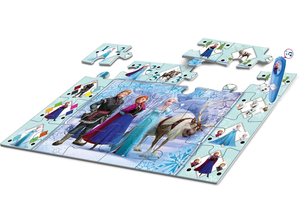 Gioco educativo Made in Italy; adatto per bambini dai 3 anni in su, include un puzzle da 24 maxi tessere in cartone robusto, una Penna elettronica interattiva, 2 Adesivi e il Manuale di Istruzioni.