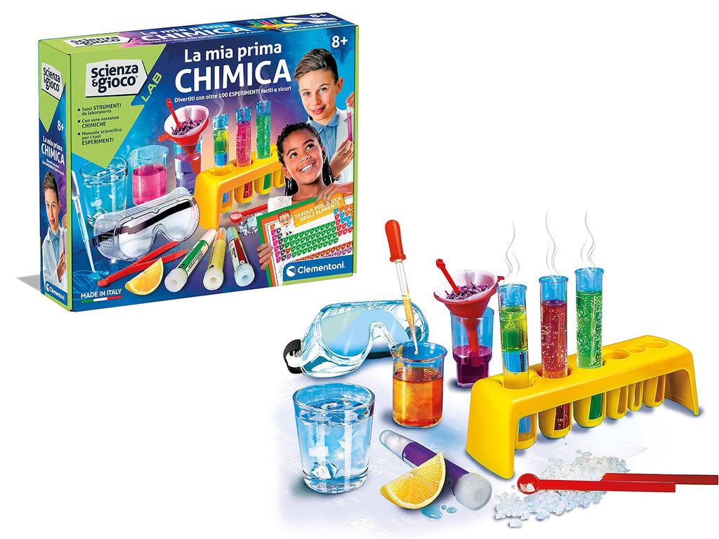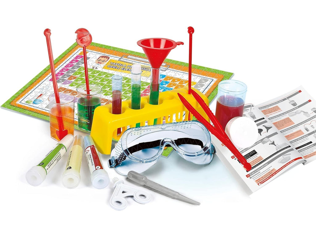 Gioco scientifico Made in Italy adatto per bambini da 8 anni in su, include strumenti scientifici, reagenti, puzzle della tavola periodica e manuale illustrato per oltre 100 esperimenti.