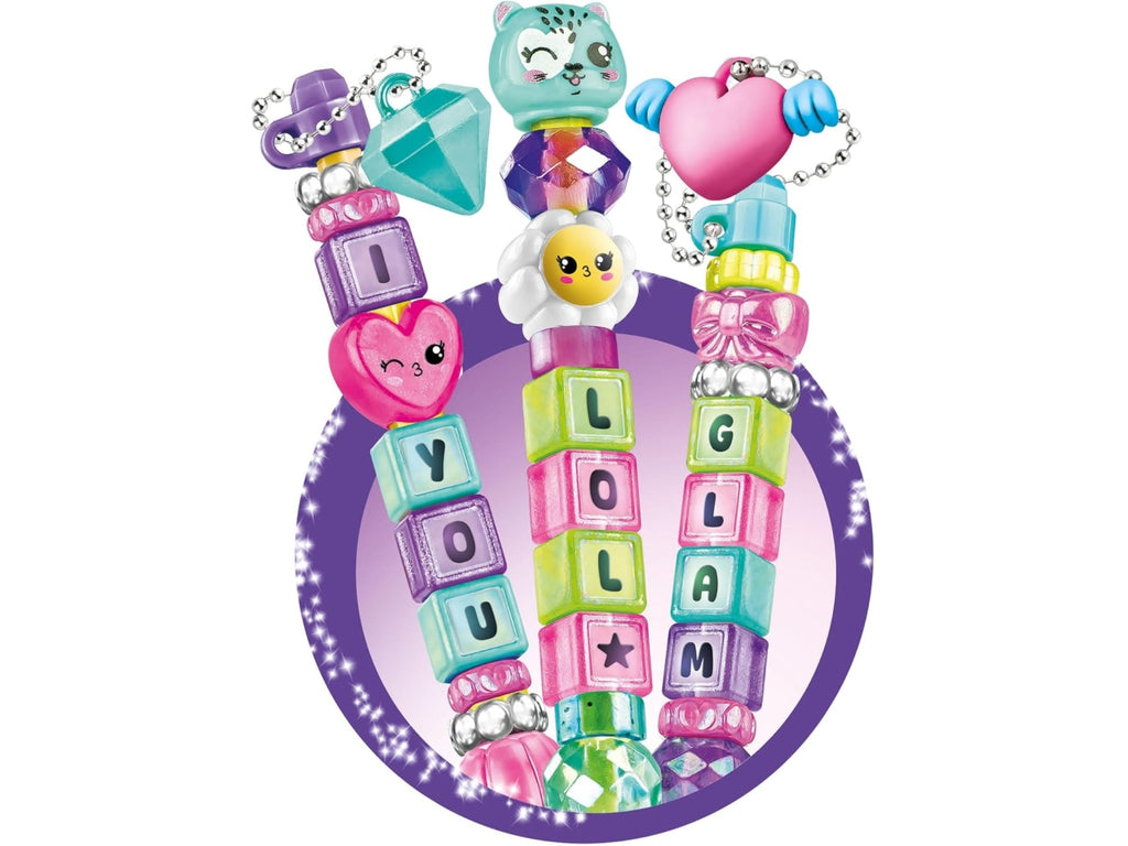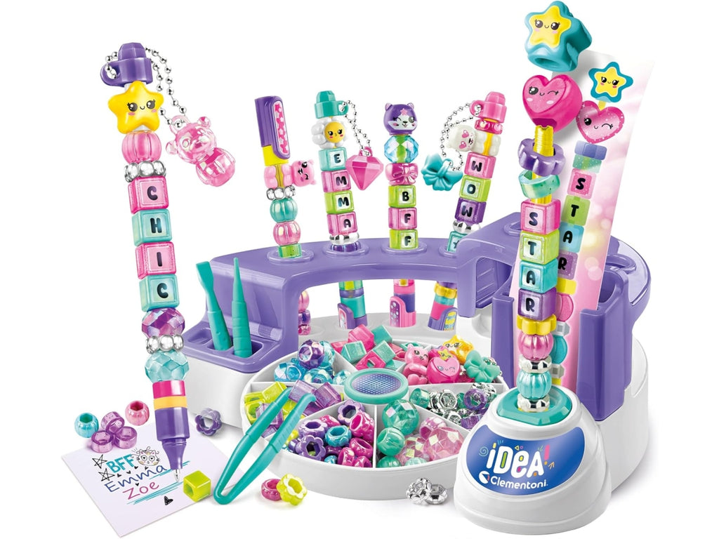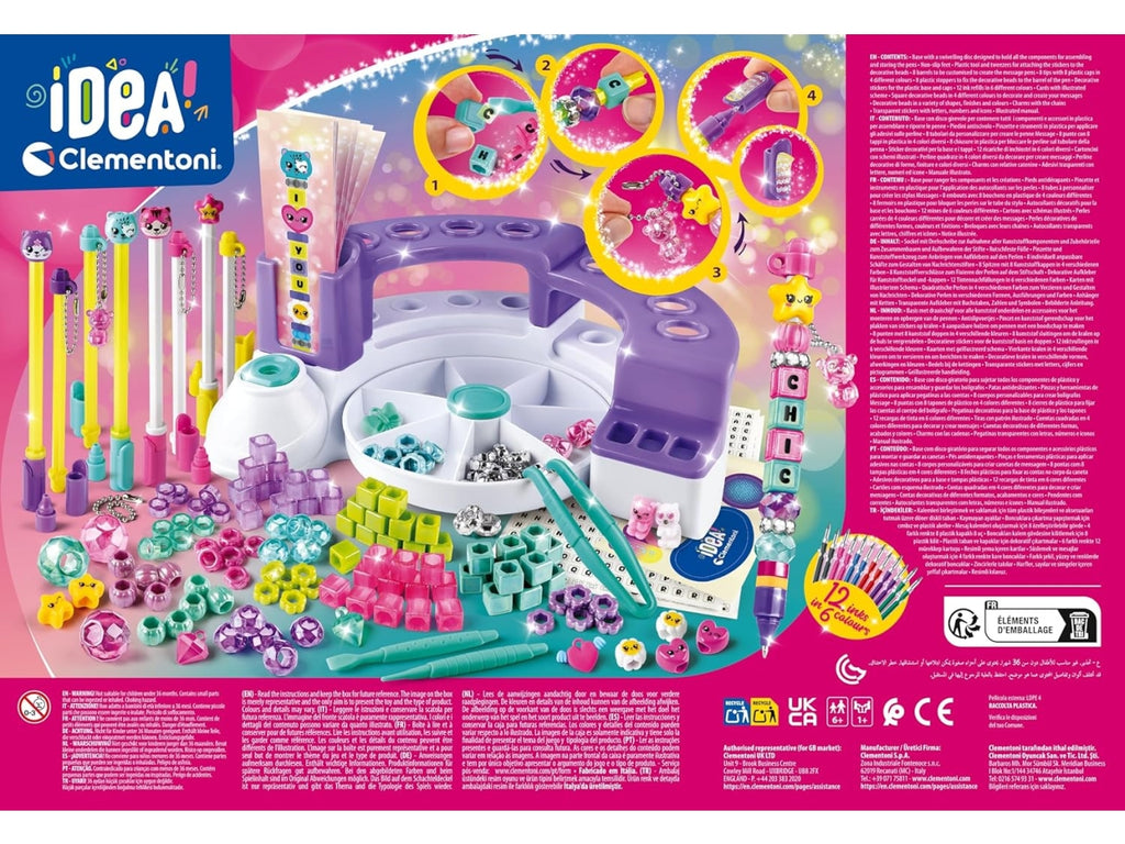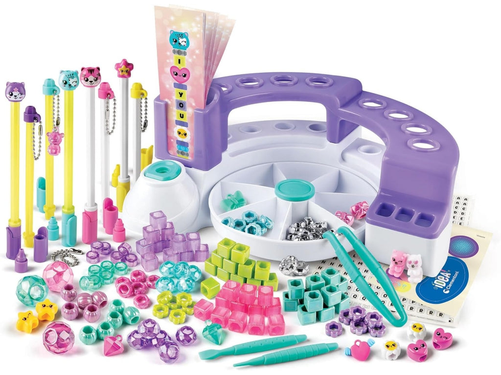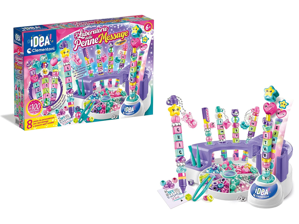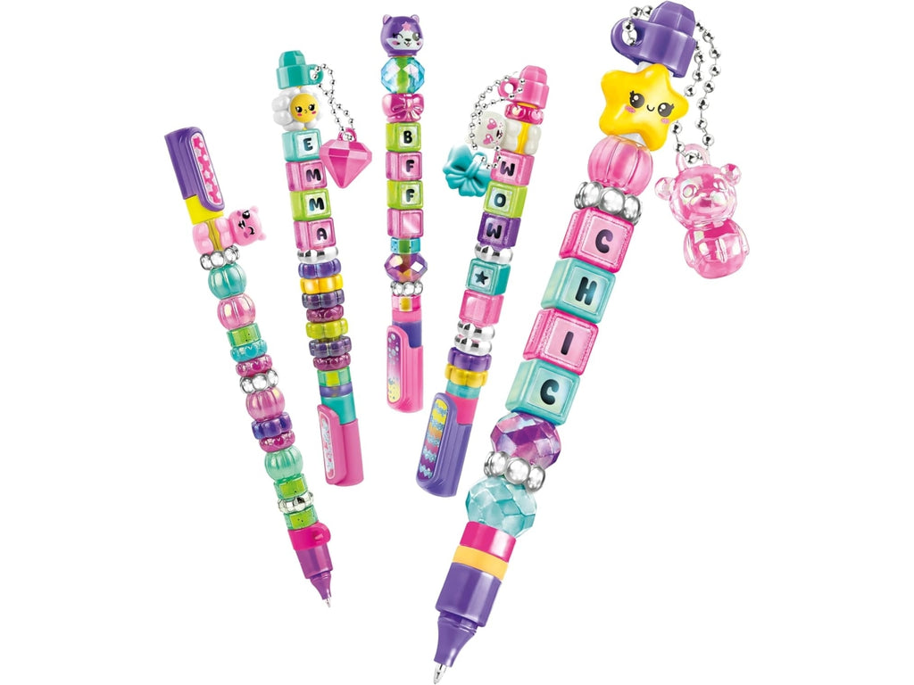 Gioco per bambine e bambini da 6 anni in su con base e strumento di infilatura, 8 penne personalizzabili, 12 ricariche in 6 colori, pinzette, perline con lettere e forme, charms con catenelle, adesivi decorativi, schede guida e manuale.