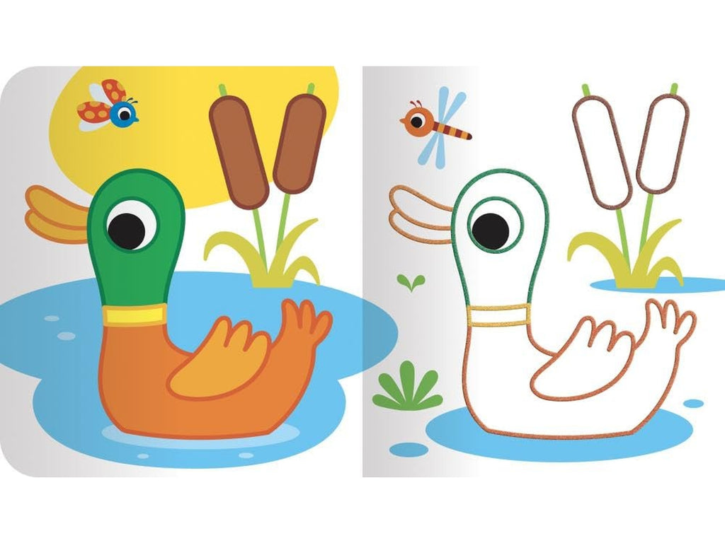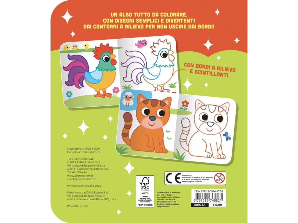 Un album da portare sempre con sé, dedicato ai più piccoli che si cimentano per le prime volte in attività di coloring: nella pagina di sinistra il modello, in quella di destra il soggetto da colorare con bordi glitterati e scintillanti a rilievo per facilitare bambini e bambine nell'attività e potenziare la motricità fine. Età di lettura: da 3 anni.