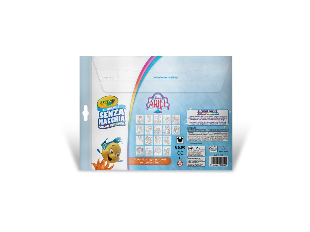 L’inchiostro senza macchia Color Wonder è trasparente e acquista colore solo sull’apposita carta e da nessun’altra parte…. come per magia! Non macchia pelle, mobili o tessuti: i bambini potranno colorare in tutta tranquillità senza paura di sporcare. 18 pagine sciolte tematizzate con gli adorabili amici del mare di Ariel Jr. e 4 pennarelli senza macchia Color Wonder. Ancora più divertimento! Passando il pennarello sulla carta appaiono dei disegni nascosti.