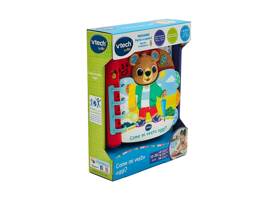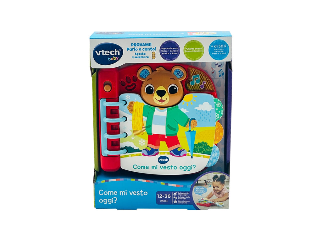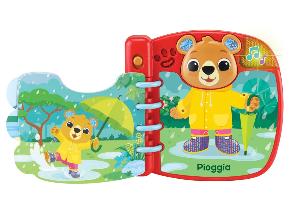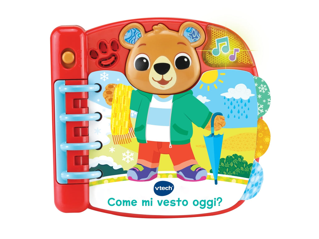 Con il simpatico orsetto, il bambino impara ad associare i vestiti al meteo. Se piove, si prende lâombrello, se fa caldo, si indossano i pantaloncini e, se nevica, ci si tiene al caldo con guanti e cappotto! ⢠Il bambino esplora il libro, gira le pagine e preme il pulsante Orsetto per scoprire i vestiti e il meteo con la neve, il sole e la pioggia. ⢠Premendo il pulsante, lâorsetto indica quali vestiti indossare a seconda del meteo riproducendo più di 50 canzoni, melodie, frasi e suoni divertenti. ⢠Pagine interattive: canzoncine, melodie e suoni accompagnano il bambino nelle sue scoperte quando gira le pagine. ⢠4 canzoni e 15 melodie. ⢠Regolazione del volume e spegnimento automatico.