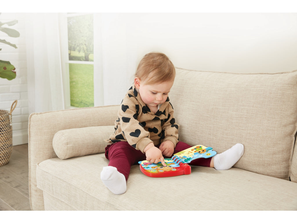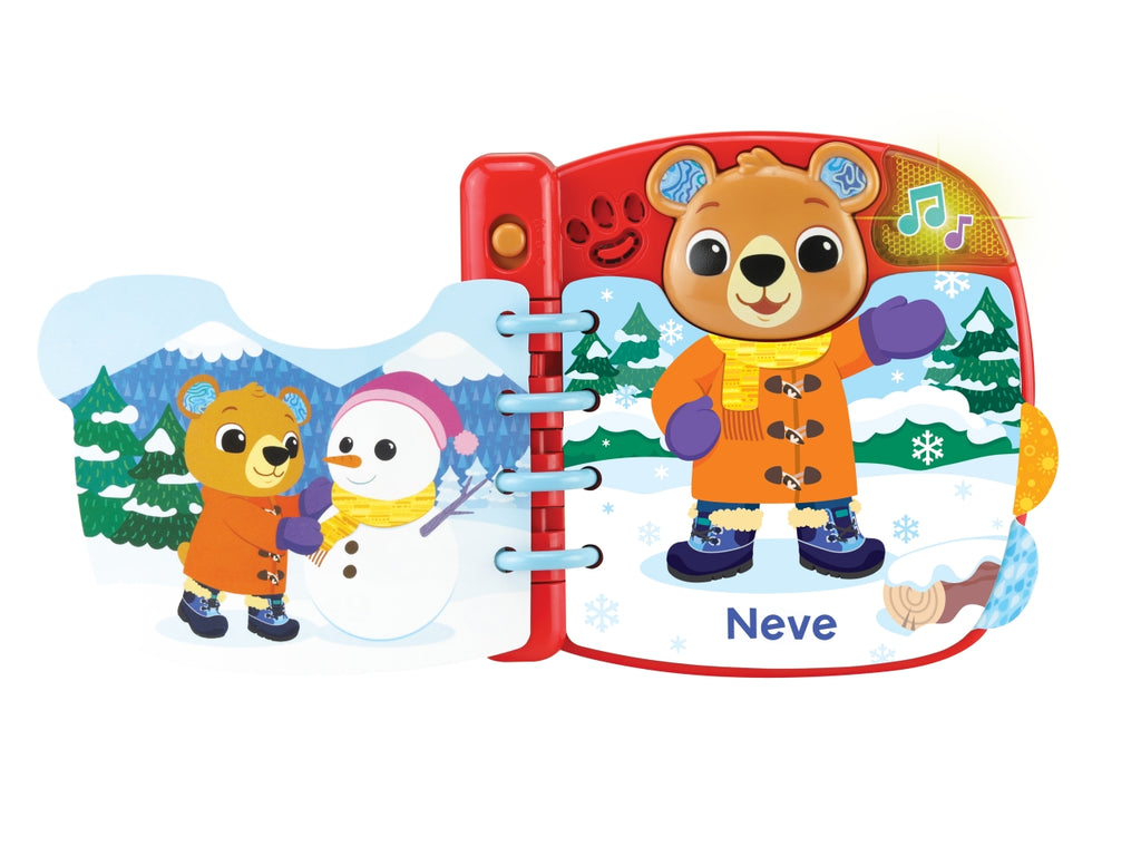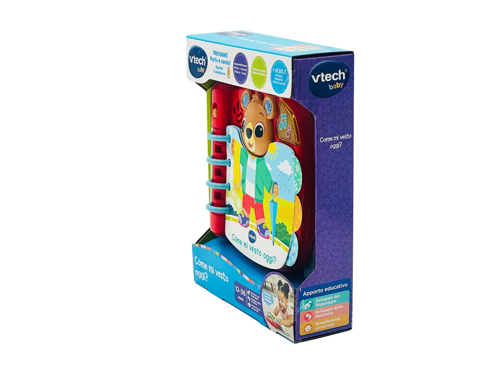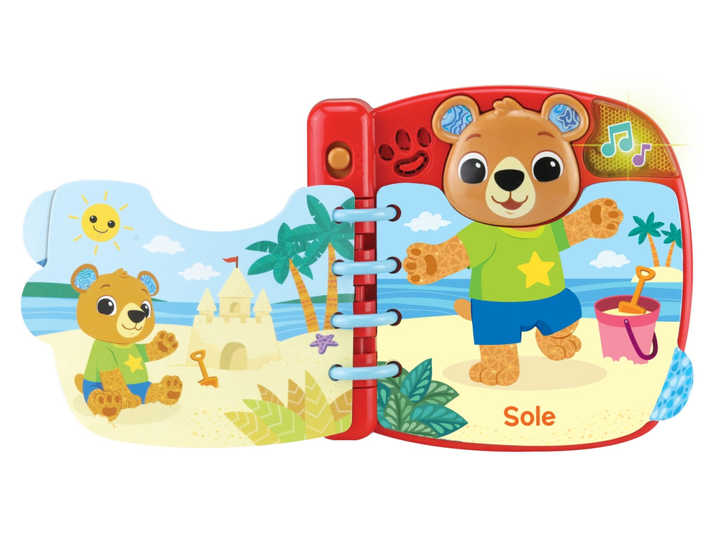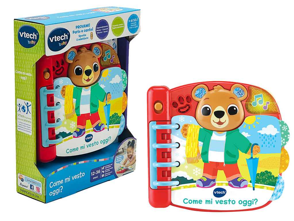 Con il simpatico orsetto, il bambino impara ad associare i vestiti al meteo. Se piove, si prende lâombrello, se fa caldo, si indossano i pantaloncini e, se nevica, ci si tiene al caldo con guanti e cappotto! ⢠Il bambino esplora il libro, gira le pagine e preme il pulsante Orsetto per scoprire i vestiti e il meteo con la neve, il sole e la pioggia. ⢠Premendo il pulsante, lâorsetto indica quali vestiti indossare a seconda del meteo riproducendo più di 50 canzoni, melodie, frasi e suoni divertenti. ⢠Pagine interattive: canzoncine, melodie e suoni accompagnano il bambino nelle sue scoperte quando gira le pagine. ⢠4 canzoni e 15 melodie. ⢠Regolazione del volume e spegnimento automatico.