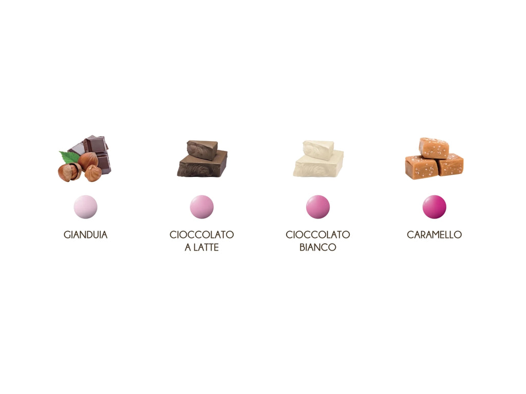 - Gusto nocciola ricoperta da cioccolato ai gusti caramello, cioccolato bianco, cioccolato al latte e gianduia.