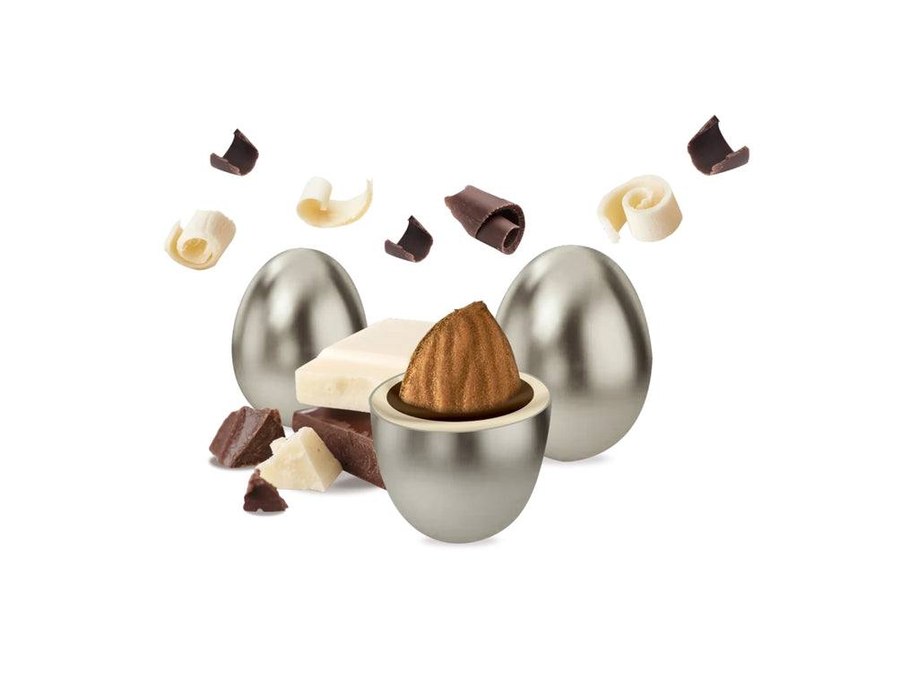 Maxtris Classico Argento con mandorla tostata ricoperta da cioccolato fondente e bianco e da un sottile strato di zucchero.