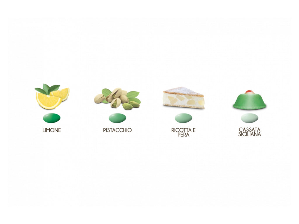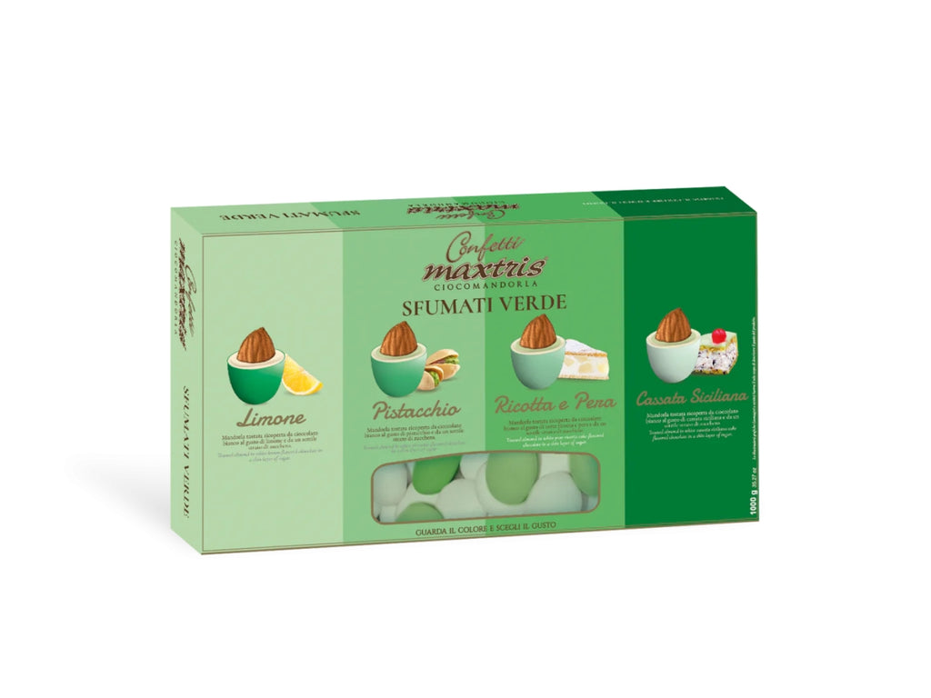 Cioccomandorla Maxtris Sfumati Verde, con mandorla tostata ricoperta di cioccolato bianco ai gusti assortiti (limone, pistacchio, ricotta e pera, cassata siciliana) e da un sottile strato di zucchero.