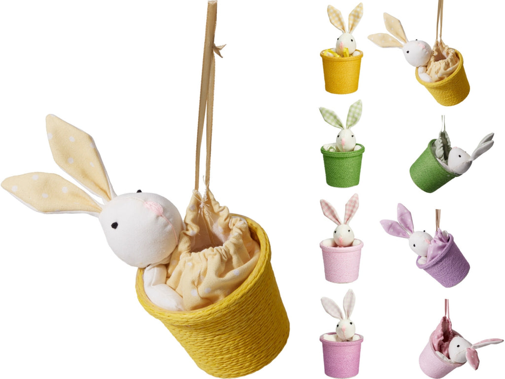 Coniglietto in cestino naturale in poliestere di dimensioni: 10x20 cm. 4 colori assortiti: giallo, verde, rosa e lilla. Le orecchie del coniglietto si abbinano ai colori del cestino. 12 pz per display.