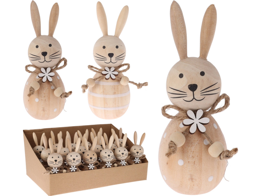 Coniglietto decorativo in legno, dimensioni: 4x4x11 cm. 2 design assortiti, colore naturale. 24 pz per display.