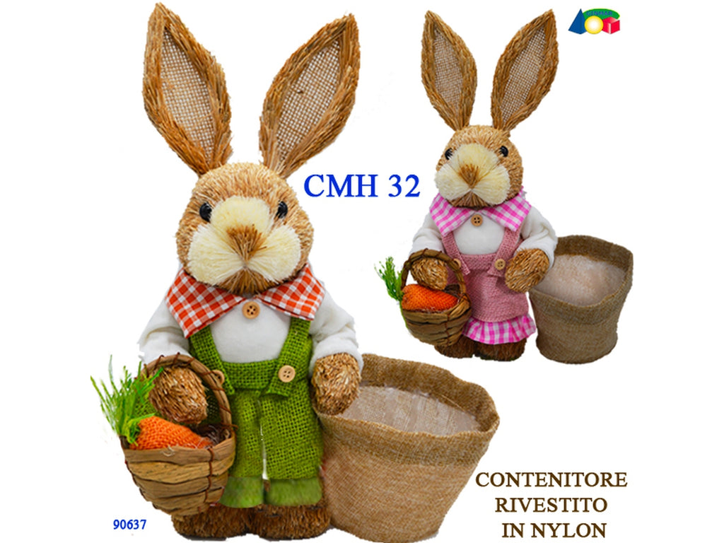 Coniglio paglia con vestito in juta colorato e sacco contenitore