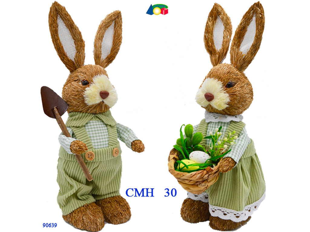Coniglio paglia con vestito in velluto, vanga e cestino