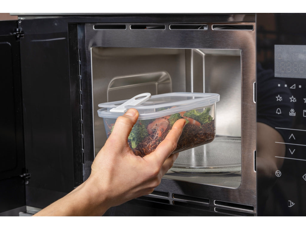 Contenitore frigo con coperchio della collezione Pull Box Chef. Questo contenitore rettangolare con coperchio a filo può contenere fino a 0,75 LT; Le dimensioni sono 12,8 x 17,8 x h 7,5 cm. Il coperchio può essere aperto e chiuso con una sola mano grazie al sistema brevettato che, unito alla guarnizione, lo rende ermetico. Può essere lavato in lavastoviglie, usato in microonde (con leva aperta) e in freezer. I materiali di costruzione lo rendono infrangibile.