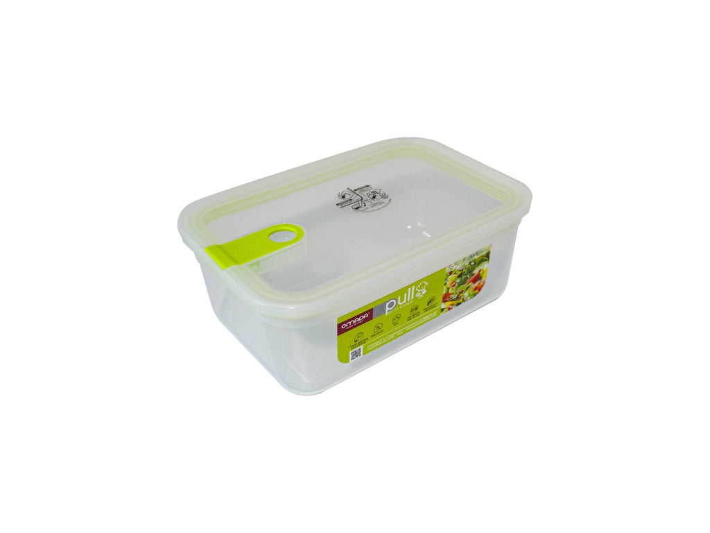 Contenitore frigo con coperchio della collezione Pull Box Chef. Questo contenitore rettangolare con coperchio a filo può contenere fino a 2,3 LT; Le dimensioni sono 17,5 x 25 x h9,5 cm. Il coperchio può essere aperto e chiuso con una sola mano grazie al sistema brevettato che, unito alla guarnizione, lo rende ermetico. Può essere lavato in lavastoviglie, usato in microonde (con leva aperta) e in freezer. I materiali di costruzione lo rendono infrangibile.