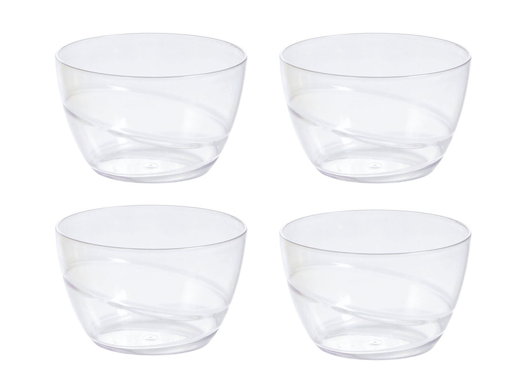 Set di 4 coppette allegra à 9,5 cm in ps trasparente ideali per servire stuzzichini, salse, macedonie o gelati. dal design semplice ma raffinato si adatta a tutte le occasioni, dalle più formali alle feste per bambini. oltre ad essere lavabile in lavastoviglie e quindi riutilizzabile, può essere anche usata per riscaldare in microonde (senza grill).