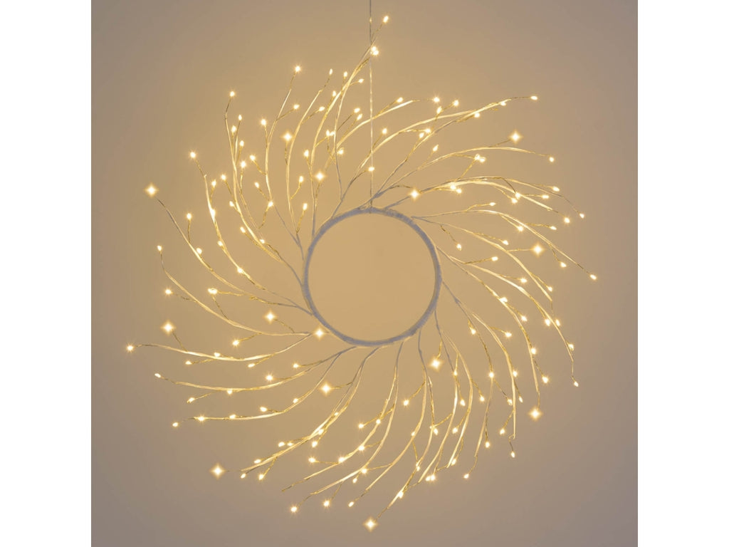 Corona di Rami TIGLIO Bianco Ø45cm 160 MicroLED BIANCO CALDO Ø1,5mm, Long Leg Led con gambo di 3cm, Cavo Metallo Argento Metal Silver, gioco di luce automatico FlashLED Diamond (144 led a luce fissa + 16 led Flash con lampeggio veloce), Trasformatore SELV di sicurezza, IP44 uso Esterno e Interno, Appendibile e da appoggio, Cavo di Alimentazione Trasparente 5m, Dim. 5m+Ø45cm, Scatola Color (XKC Art. RAB TG WH45S M160-H).