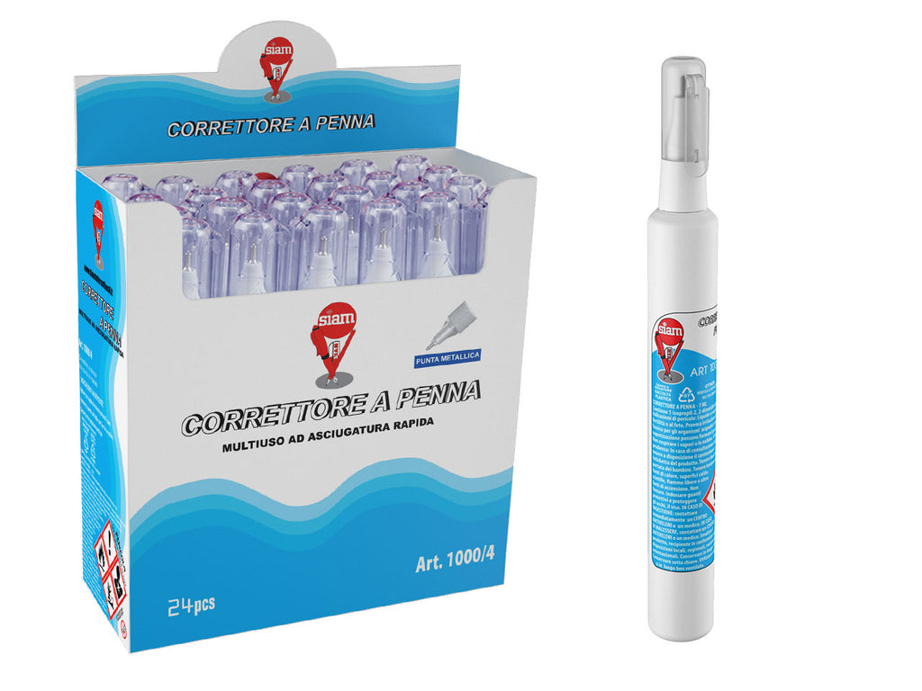 fusto in plastica con punta in metallo, dotato di cappuccio con clips, contenuto 7ml. Inodore.