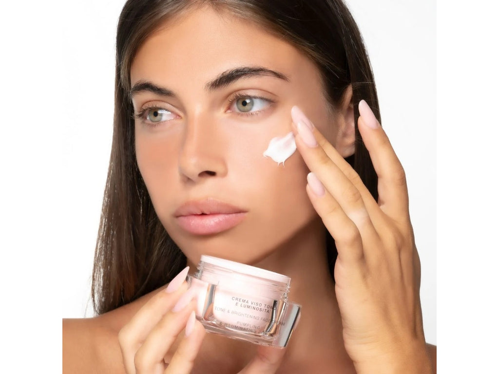 Primo Step: Utilizza Crema Viso Tono e Luminosità quotidianamente, nella tua routine di skincare mattutina e serale dopo la detersione, la lozione e l'applicazione del Siero Illuminante Collagene + Vitamina C.