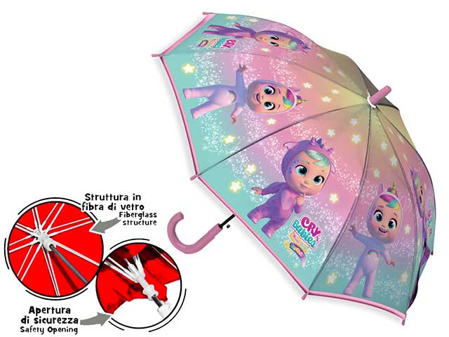 L'ombrello in pvc per bambina cry babies è perfetto per le giornate di pioggia. l'ombrello è ad uso riservato per bimbi e bimbe e infatti è di piccole dimensioni, leggero e facile da impugnare e maneggiare. l'intelaiatura è in fibra di vetro, con un'apertura di sicurezza che si blocca per tenere l'ombrello aperto e per evitare che si chiuda di scatto. sulla tela sono raffigurati i personaggi. una bambolina cry babies che tiene per mano il suo migliore amico.