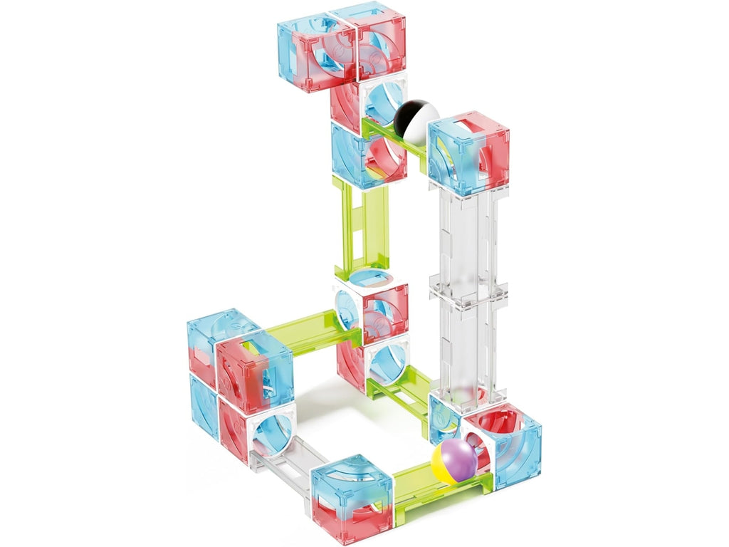 Cuboga include 70 pezzi colorati e resistenti, tra cui cubi trasparenti rossi, azzurri e verdi, e 5 piste trasparenti che offrono diverse opzioni di costruzione. Il set include anche biglie luminose che aggiungono un effetto sorprendente mentre scorrono sulla pista. Facile da assemblare, sicuro e progettato per bambini dai 3 anni in su, è un gioco perfetto per casa o scuola.