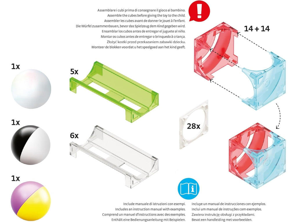 La confezione di Cuboga include 70 pezzi: 14 + 14 cubi trasparenti rossi e azzurri, 5 piste trasparenti, 6 piste trasparenti verdi, 28 piastrine di collegamento, 1 biglia luminosa e 2 biglie a due colori. Ogni elemento è progettato per stimolare la fantasia e permettere ai bambini di costruire percorsi infiniti, creando giochi e sfide sempre nuovi. Un set completo per un divertimento senza fine.