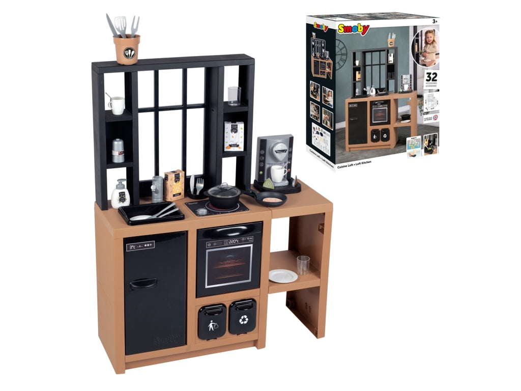La cucina Loft è una cucina di stile industriale completa di tutto quello che occorre per preparare tante ricette. Il suo design dalle linee pulite e moderne si adatterà perfettamente a tutte le camerette o le stanze di casa. La cucina è composta da un piano cottura, un grande forno e frigorifero, un lavello, una macchina per il caffè, spazi per appoggiare e ritirare tutti gli accessori. 32 accessori inclusi: 3 utensili da barbecue, 2 forchette, 2 coltelli, 2 cucchiai, 2 piatti, 2 bicchieri, 2 tazze, 3 capsule caffè, 1 padella, 1 pentola, 1 coperchio pentola, 2 scatole finte, 1 frittella, 5 pasta termosensibile, 1 macina sale-pepe, 2 barattoli portautensili. Altezza piano di lavoro: 50 cm. Made in France