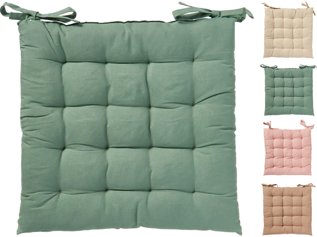 Cuscino quadrato per sedia con lacci, poliestere, dimensioni: 40 x 40 cm, peso: 650 grammi. 4 colori pastello assortiti: rosa, ecrù, tortora e verde, imbottitura in cotone riciclato. Confezione da 24 pezzi in scatola espositiva bianca.