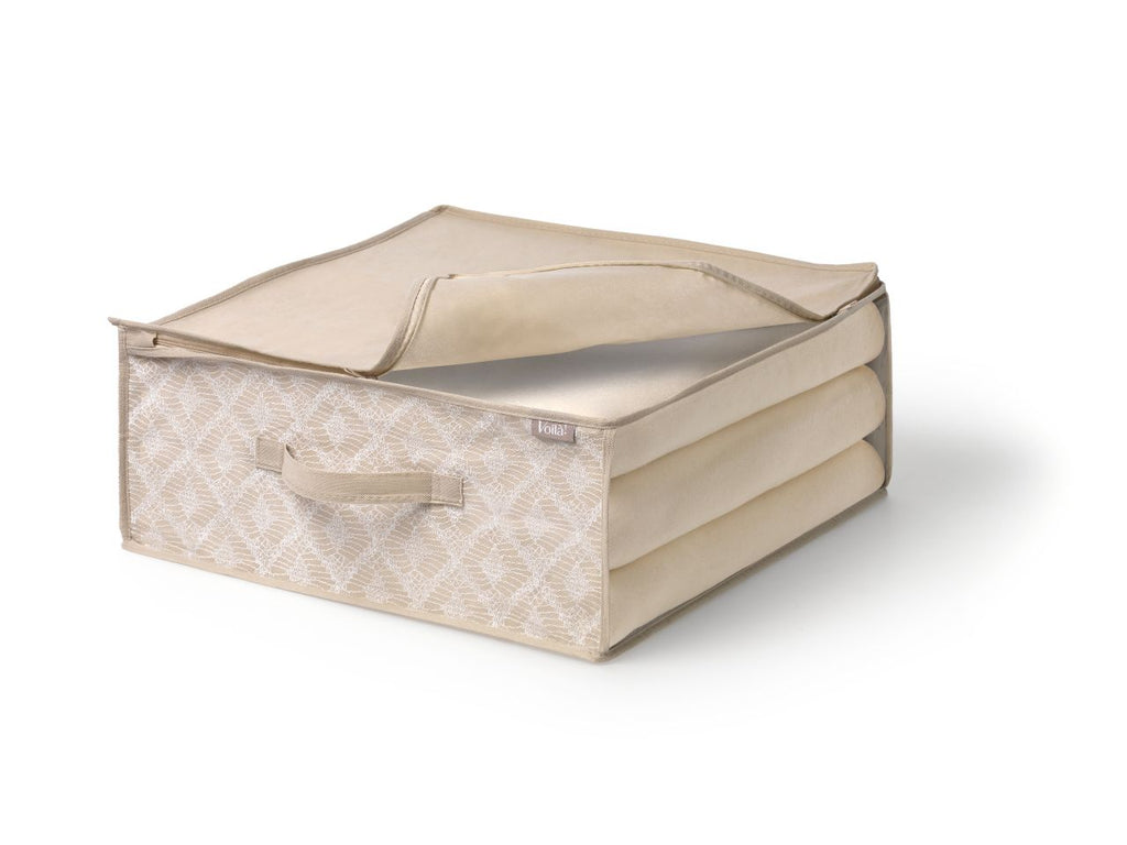 Custodia salvacoperta in tnt "macramé" colore: beige misure: 45x45x20 cm. dotata di pratica finestra laterale e comoda apertura superiore, il tessuto non tessuto è un materiale altamente traspirante e resistente agli strappi, ideale per coperta a una o a due piazze e per trapunta/piumone ad una piazza.