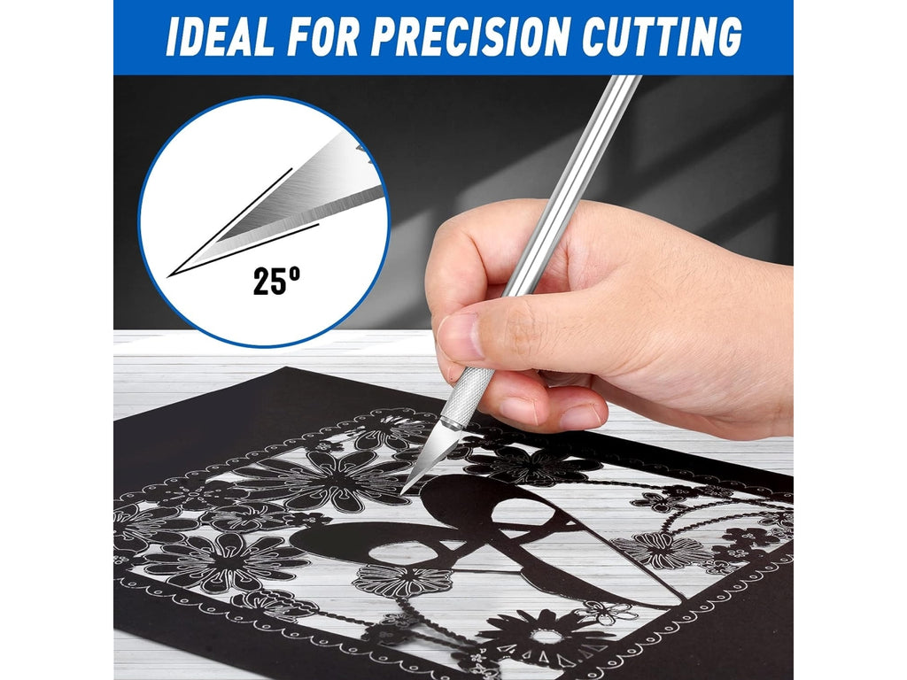 Un leggero coltello artistico con impugnatura in metallo con texture riduce efficacemente il livello di affaticamento della mano e offre una presa più stabile quando lo si utilizza. Sistema lama facile da sostituire: cambio lama affilato in 5 secondi o meno.