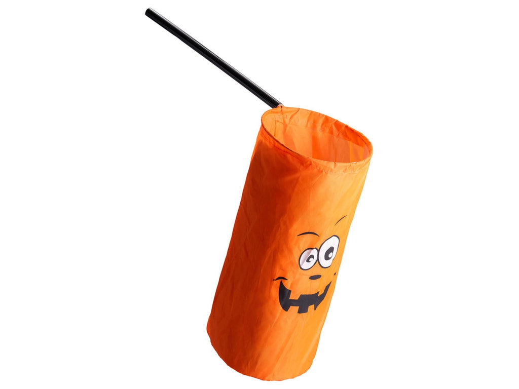 Borsa sacchetto zucca in tessuto plastificato applicato al manico in plastica, accessorio ideale per fare "dolcetto o scherzetto" il giorno di Halloween.