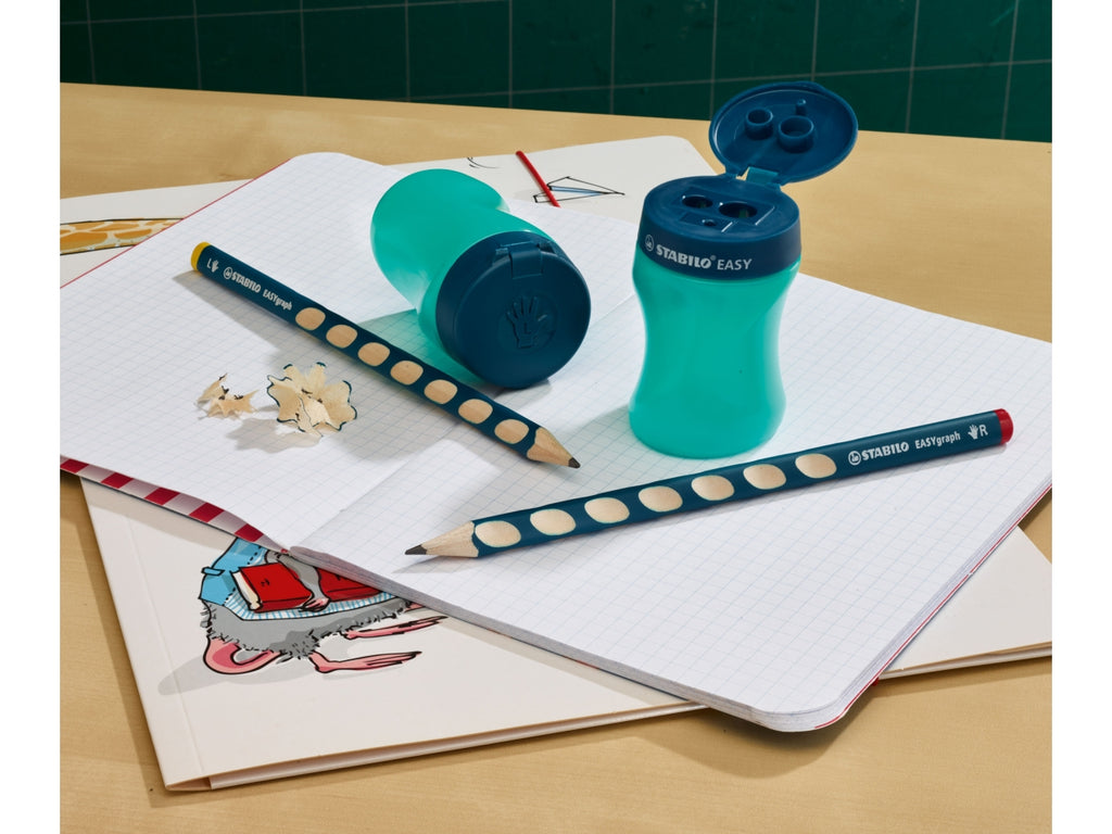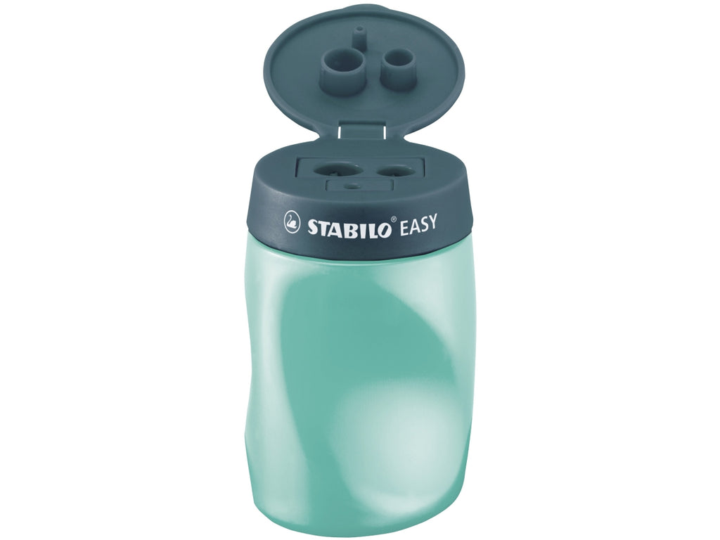 Stabilo Easy temperamatite è il temperino con serbatoio ergonomico differenziato per destrimani o mancini. Dotato di pratico coperchio, può temperare matite con 3 diametri diversi. Stabilo Easy è il temperamatite perfetto per Easycolors, Easygraph, Easyergo 3.15 e tutte le matite in legno standard. Studiato per i bambini dai 5 anni in su, è ideale da portare a scuola! Questo temperino è studiato per garantire il massimo comfort alle mani piccole dei bambini. Il coperchio è richiudibile ed è dotato di una vite di sicurezza per evitare qualsiasi lesione e le esclusive impugnature sagomate per destrimani e per mancini favoriscono la corretta postura delle dita.