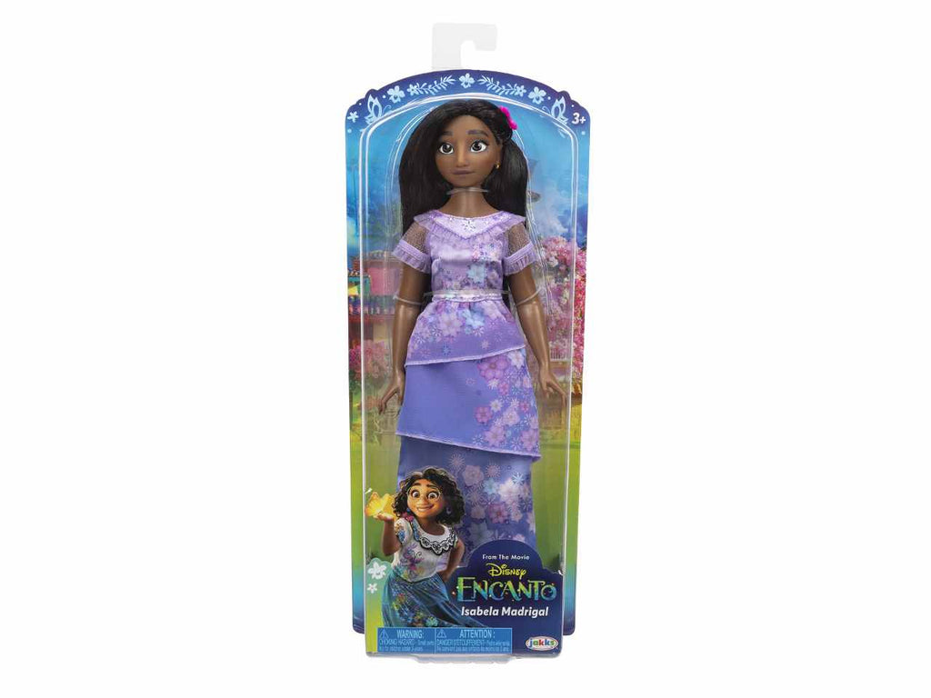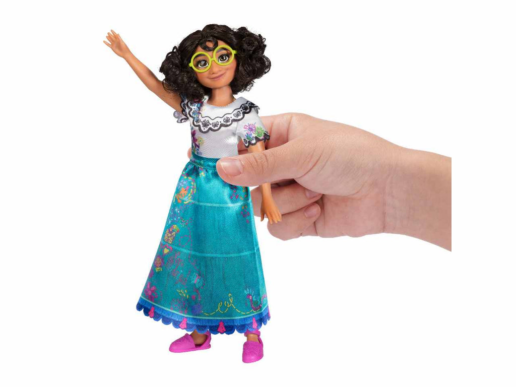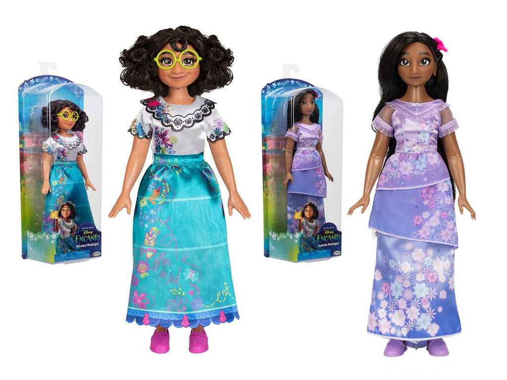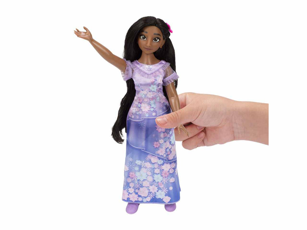 Mirabel Madrigal di Encanto della Disney arriva indossando il suo vestito e gli accessori caratteristici! Proprio come nel film, l'abito di Mirabel presenta un bellissimo colletto smerlato e maniche con autentici ricami in stile. La sua lunga gonna verde acqua presenta icone colorate e motivi ispirati ai doni magici della sua famiglia, proprio come nel film! Guarda attentamente i disegni e troverai il nome di Mirabel stampato sulla sua gonna, proprio come il suo vestito in Encanto! I suoi occhiali verde brillante, gli orecchini con pompon viola e le scarpe espadrillas magenta completano il suo look classico. Con la tua nuova amica Mirabel Madrigal, puoi fingere di vivere le tue magiche avventure. Isabela Madrigal di Encanto della Disney arriva indossando il suo vestito e gli accessori caratteristici! Proprio come nel film, lo splendido vestito color lavanda di Isabela presenta bellissimi dettagli con volant sul colletto e sulle maniche. La sua delicata gonna a strati è decorata con splendidi fiori rosa, viola e blu, proprio come il suo vestito in Encanto! Lo splendido fermaglio per capelli a fiori di Isabela, i delicati orecchini d'oro e le scarpe espadrillas viola completano il suo look classico. Con questa bambola Isabela Madrigal, puoi fingere di avere anche i poteri dei fiori!