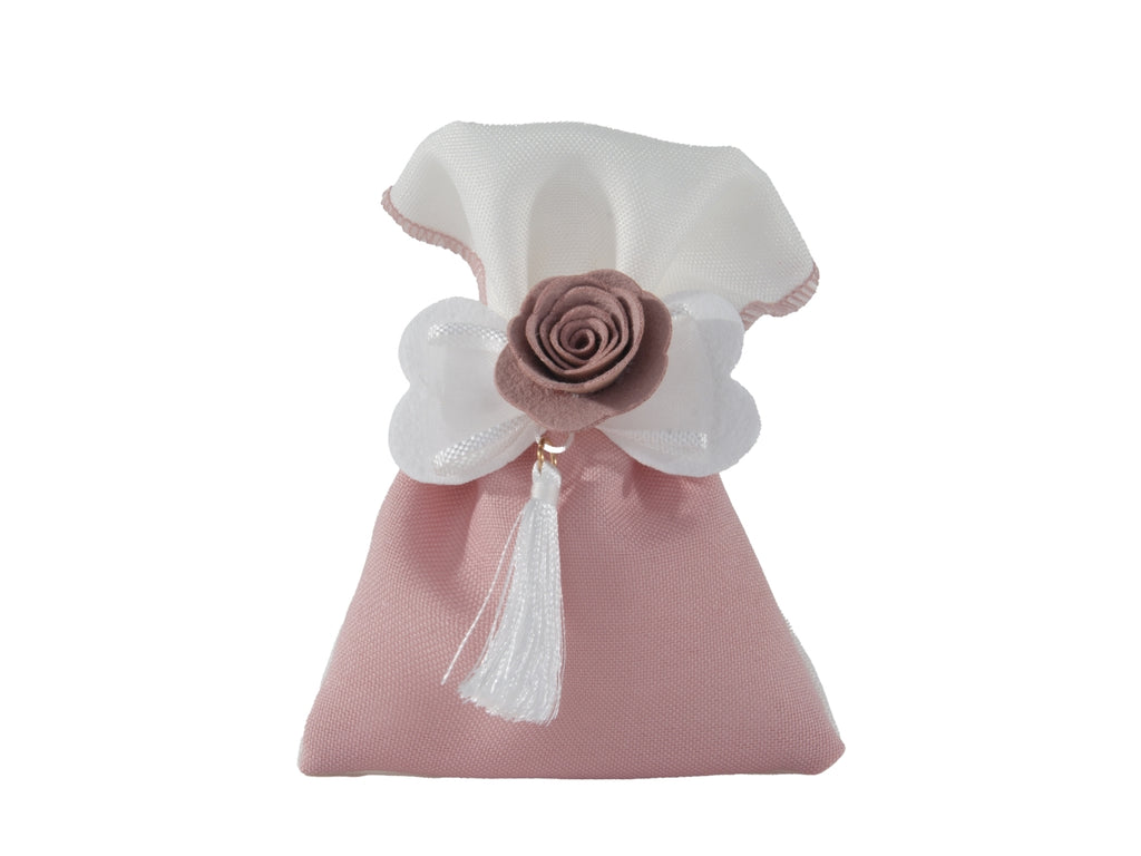 Epoque sacchetto portaconfetti in tessuto 10x13cm con fiocco e rosellina rosa antico