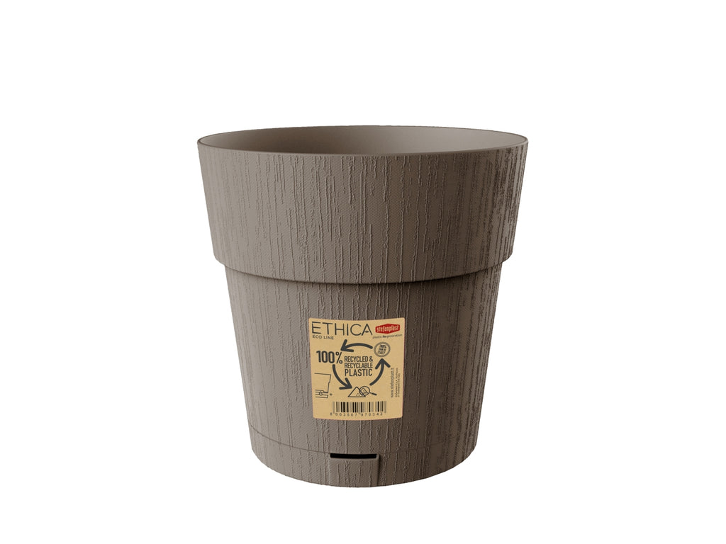 Vaso in plastica riciclata dalle finiture eleganti elaborate su geometrie perfette. La materia ricrea l’effetto raffinato del tessuto in una sofisticata finitura al tocco, un connubio elaborato ad arte che lo rende estremamente innovativo.