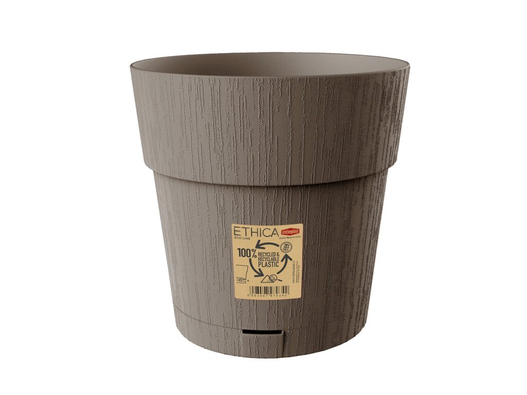 Vaso in plastica riciclata dalle finiture eleganti elaborate su geometrie perfette. La materia ricrea l’effetto raffinato del tessuto in una sofisticata finitura al tocco, un connubio elaborato ad arte che lo rende estremamente innovativo.