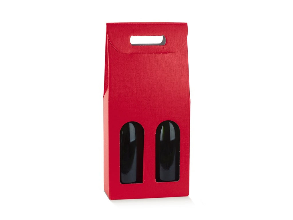 Scatola in cartone accoppiato con maniglia per confezionare 2 bottiglie verticali modello bordolese, borgognotta. Il cartone fustellato delle finestre si utilizza come separatore per le bottiglie.