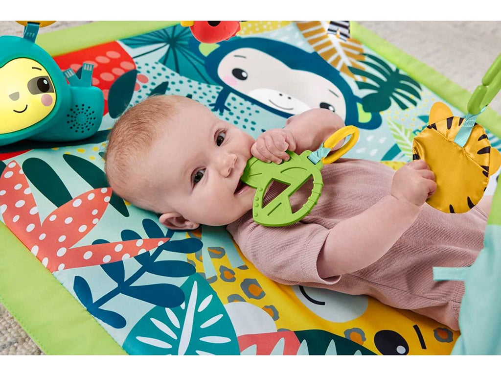 La palestrina sensoriale cuccioli della natura 3-in-1 fisher-price® cresce insieme al tuo bambino, dalla nascita fino ai primi passi, con una serie di simpatiche sorprese sensoriali. i neonati possono sdraiarsi sul morbido tappetino con 6 giocattoli sospesi sugli archi. per giocare distesi sul pancino, puoi far scorrere verso il basso l'arco regolabile e avvicinare i giocattoli, mentre il cuscino a forma di giraffa sostiene il bambino durante il gioco. inoltre, il bradipo con musica e luci offre un'esperienza di gioco divertente man mano che il bambino passa dal gioco disteso sul pancino a quello seduto e in viaggio.tappetino e cuscino di supporto sono lavabili in lavatrice (con gli archi e i giocattoli rimossi)