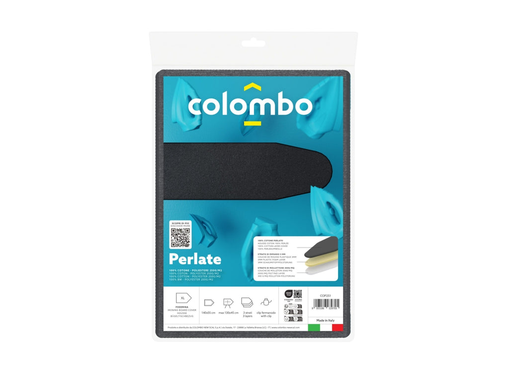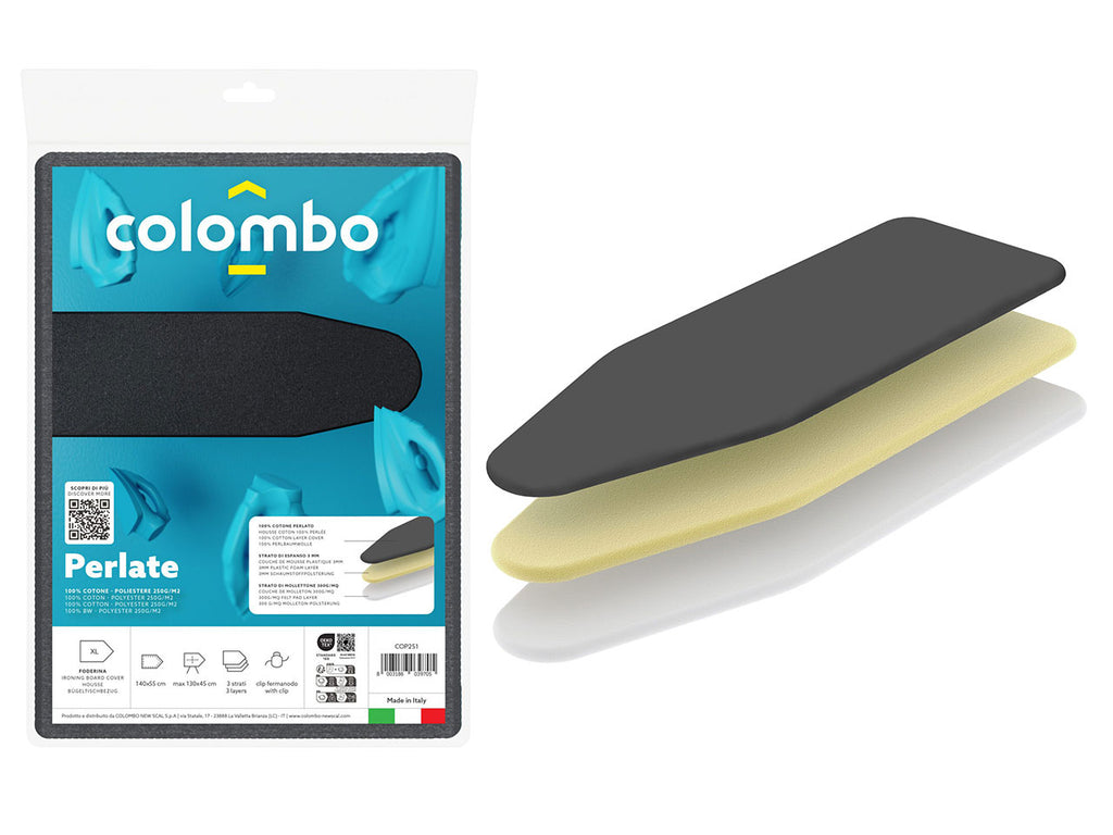 Foderina da stiro universale a tre strati, adatta per assi fino a 120x65 cm. La superficie è in 100% cotone perlato o metallizzato, studiata per riflettere il calore e ottimizzare la stiratura. Lo strato centrale è composto da 3 mm di schiuma plastica che offre comfort e stabilità durante l’uso. Il fondo è rinforzato con 300 g/m² di mollettone in poliestere, ideale per una lunga durata e resistenza. Dotata di clip fermanodo per una perfetta aderenza alla tavola. Prodotto interamente in Italia.