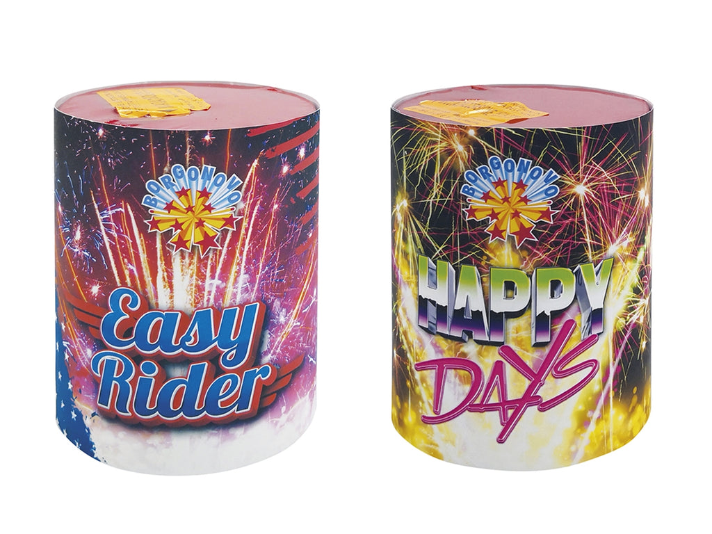Assortimento di 2 batterie di fontane HAPPY DAYS: show di 3 fontane con effetto verde con fiori argento, oro con crisantemi gialli, rosa con cracker argento EASY RIDER: show di 3 fontane assortite con effetto rosso con crisantemi argento, oro con cracker e blu con crisantemi argento.