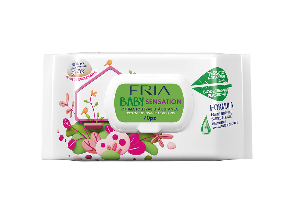 Comode ed utili in ogni momento della giornata, le salviette FRIA BABY SENSATION in nuovo morbido tessuto ultra soffice e resistente, svolgono una completa e delicata azione igienica e di idratazione dellâepidermide senza alterare il naturale pH fisiologico del bambino. La sicurezza dei prodotti per bambini è ciò che ogni mamma cerca per i propri figli, soprattutto per lâigiene quotidiana. Questa particolare formulazione cremosa con BURRO DI KARITEâ nasce da una specifica ricerca di un prodotto innovativo e di altissimo livello qualitativo, studiato appositamente per soddisfare le esigenze delle pelli delicate e sensibili dei neonati. Gli estratti glicerici di Camomilla e Calendula utilizzati sono ottenuti da piante coltivate in regime di agricoltura biologica, per garantire una sicurezza ancora maggiore di un prodotto delicato e ben tollerato. La particolare formulazione lascia sulla pelle del bambino un sottile strato protettivo che dona morbidezza e idratazione e non necessita lâaggiunta supplementare di creme o lozioni dopo la pulizia.