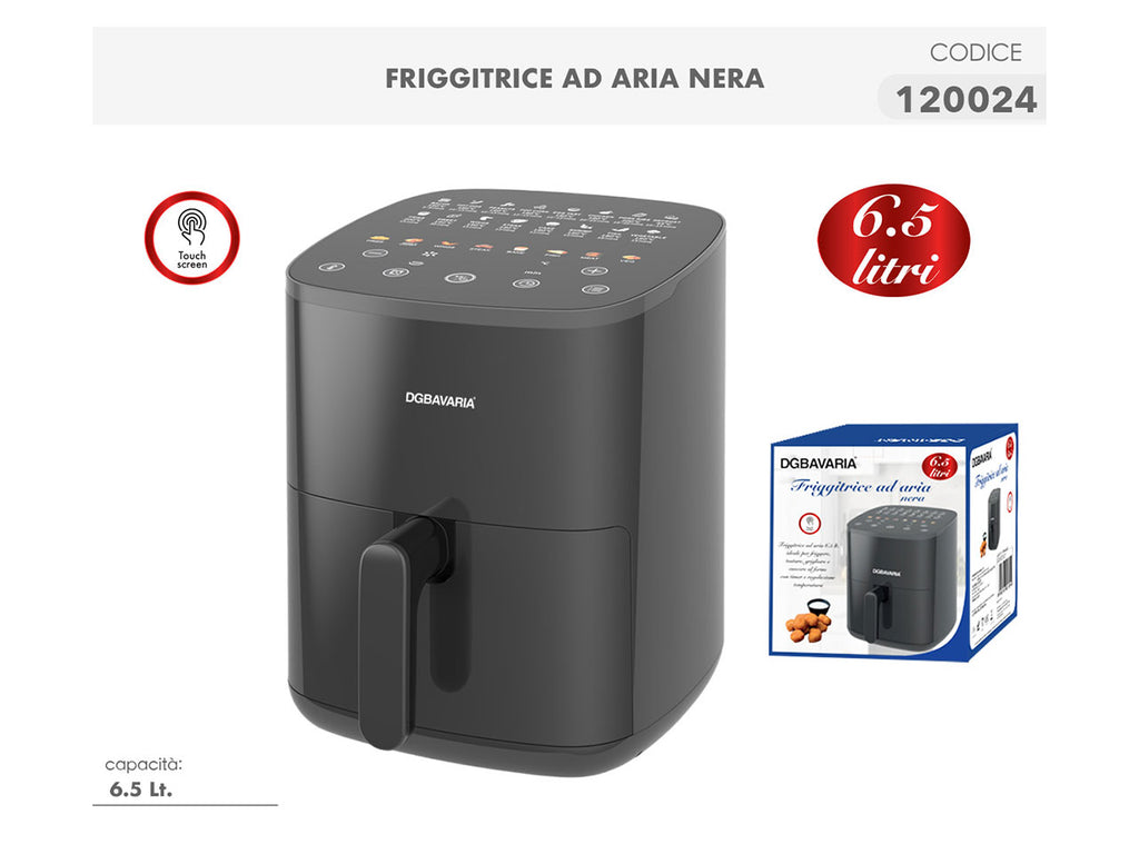 Questa friggitrice ad aria è progettata per un'esperienza di cottura salutare e senza olio, dotata di un capiente serbatoio da 6,5 litri. Offre un sistema di circolazione dell'aria calda che garantisce una cottura uniforme e veloce, mentre la regolazione della temperatura da 35 a 200 gradi centigradi permette di preparare una vasta gamma di piatti. Il timer di 60 minuti, il touch screen intuitivo e gli indicatori luminosi rendono l'uso estremamente facile. La friggitrice è anche progettata per ridurre l'emissione di odori e facilitare la pulizia, rendendola un complemento ideale per qualsiasi cucina moderna.