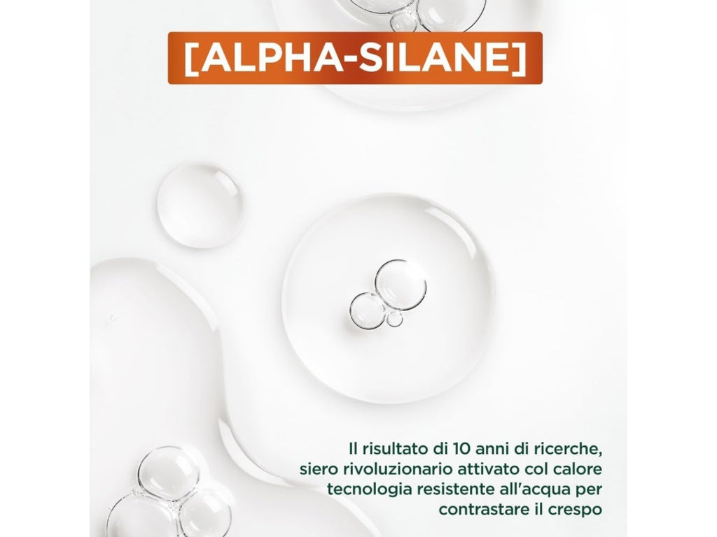 Tecnologia Alpha-Silane attivata dal calore, Non appesantisce e non unge, Effetto anti-crespo e capelli lisci e lucenti fino a 10 giorni*, *Test strumentale dopo l'applicazione del siero.